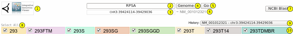 This field will always contain the current genome location visualized. It is also an editable field which enables direct modification of the current visualized location. (e.g.: chr17:38449837-38531026,...)