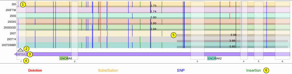The graph also highlights the exons, of the visualized transcript, by means of a transparent white square. In the example RPSA - NM_001012321 has six exons.