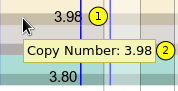 The copy-number of each cell-line is visualized via a black transparent square. The actual value can be found in the middle of the square (1) or by hovering over any position of the square (2).